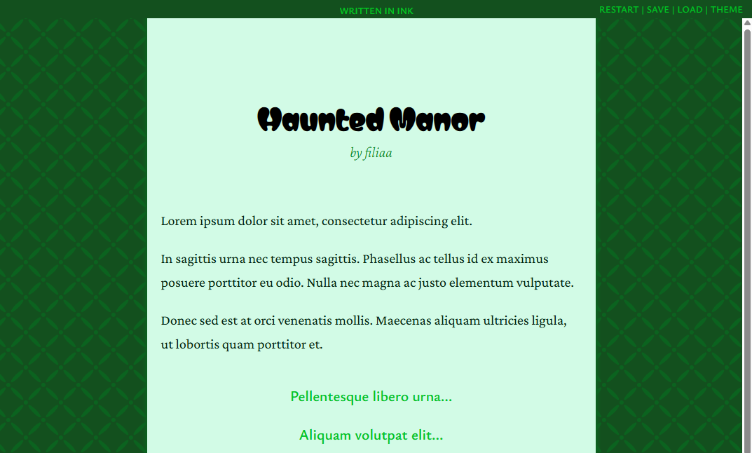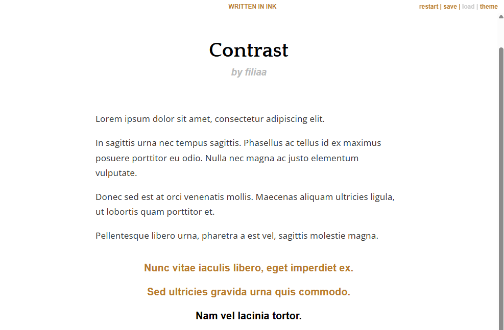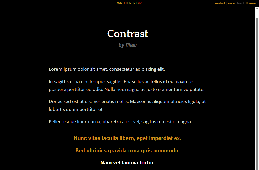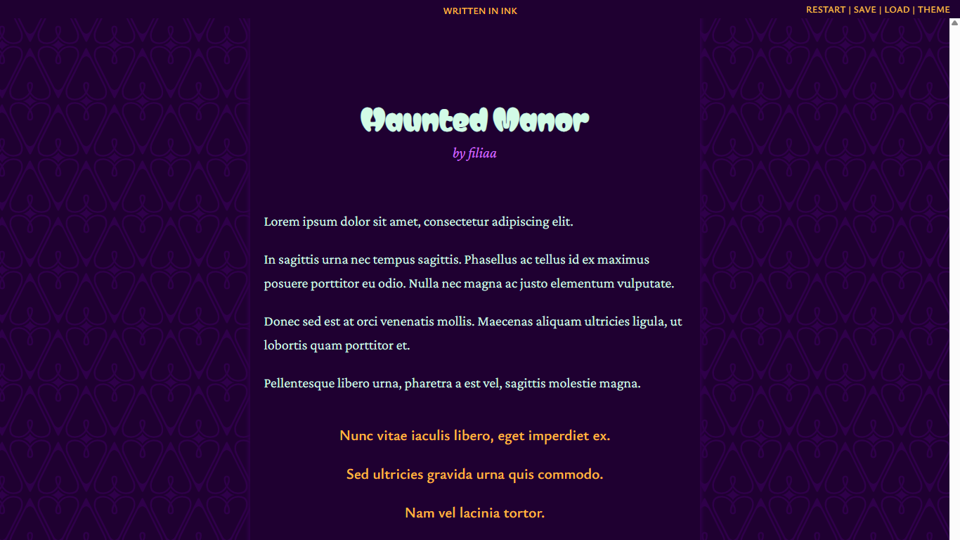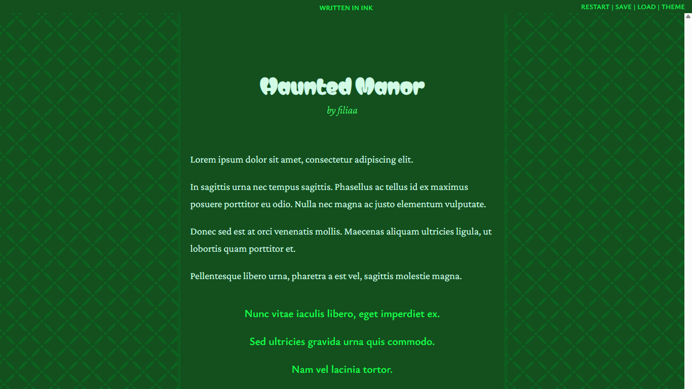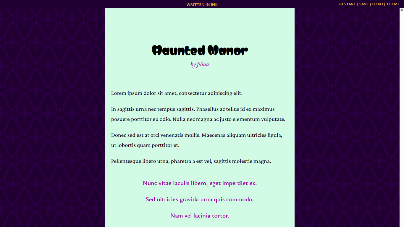 This is a small collection of CSS stylesheets for stories created with ink (and exported for the web). You can use them as is or modify them at will.